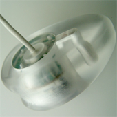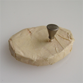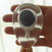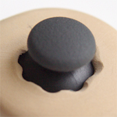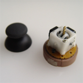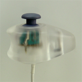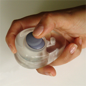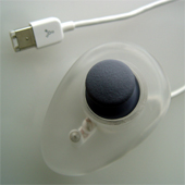 | In making the Keybong we searched for the simplest form that would enable performing the writing gestures comfortably with either hand. It contains a joystick that is also a push-button. The first Keybong versions were round; then the shape was modified to ensure that it does not rotate in the hand. A version in which physical grooves helped in finding the eight perimeter locations was tested; it was decided not to use it so that the navigations would be performed solely by sound. |